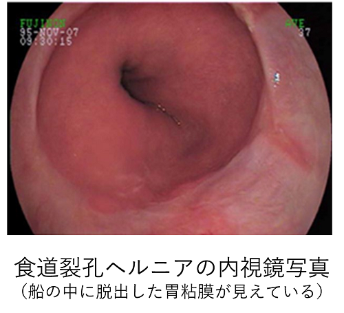 胸とお腹を隔てている横隔膜には、食道がぎりぎり通る隙間があります。これを「食道裂孔(れっこう)」といいます。「食道裂孔ヘルニア」とは、胃がこの裂孔から胸へ飛び出してしまった状態です。ヘルニアは胃液が逆流しやすくなり、食道炎を起こします。