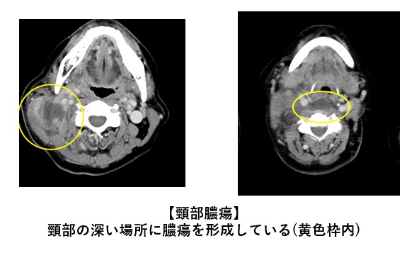 発症契機としては、扁桃炎・扁桃周囲炎や扁桃周囲膿瘍、急性咽喉頭炎、齲歯などの歯原性疾患、リンパ節炎などの初感染巣、あるいは食道・気管の損傷、皮膚疾患などが原因として挙げられ、炎症の波及や増悪時に頸部に膿瘍の形成を来たし、発症します。症状は、発熱、咽頭痛、呼吸困難、圧痛などが挙げられます。咽喉頭の浮腫(ふしゅ)による呼吸苦が出現している症例に関しては、早急な対応が必要です。