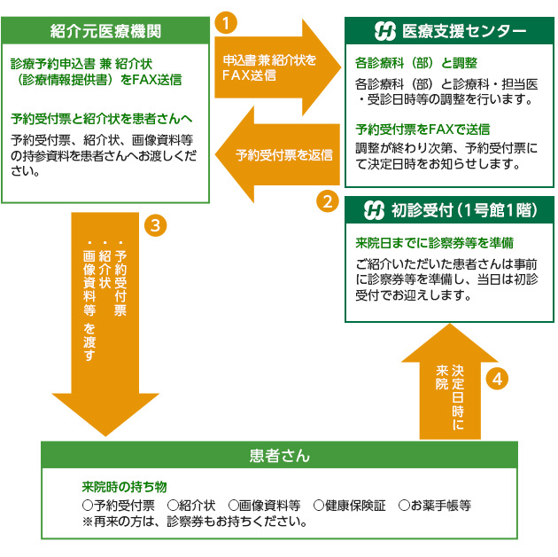 - 医療支援センター経由でご紹介いただいた患者さんは、事前にカルテを作成し、待ち時間の短縮を図っております。来院当日は紹介受付票・紹介状(あれば画像資料等)・保険証をお持ちの上、1号館1階の初診受付までお越しください。