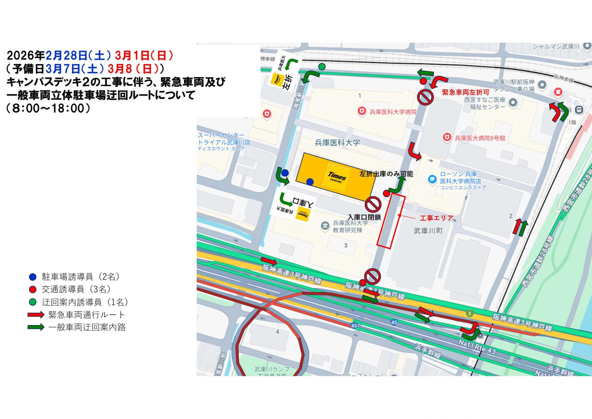 新病院棟キャンパスデッキ2の足場解体工事に伴い、2026年2月28日(土)・3月1日(日)8:00~18:00の間、周辺道路の一部が通行止めとなります。