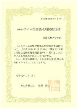 兵庫医科大学病院は、厚生労働省より2019年9月19日付けで「がんゲノム医療拠点病院」に指定されました。「がんゲノム医療拠点病院」は、がんゲノム医療を提供する機能を有する医療機関として「がんゲノム医療中核拠点病院(全国11カ所)」とともに同医療の拠点となる病院であり、この度、全国で34施設、兵庫県内では当院を含めた3施設が指定されました。