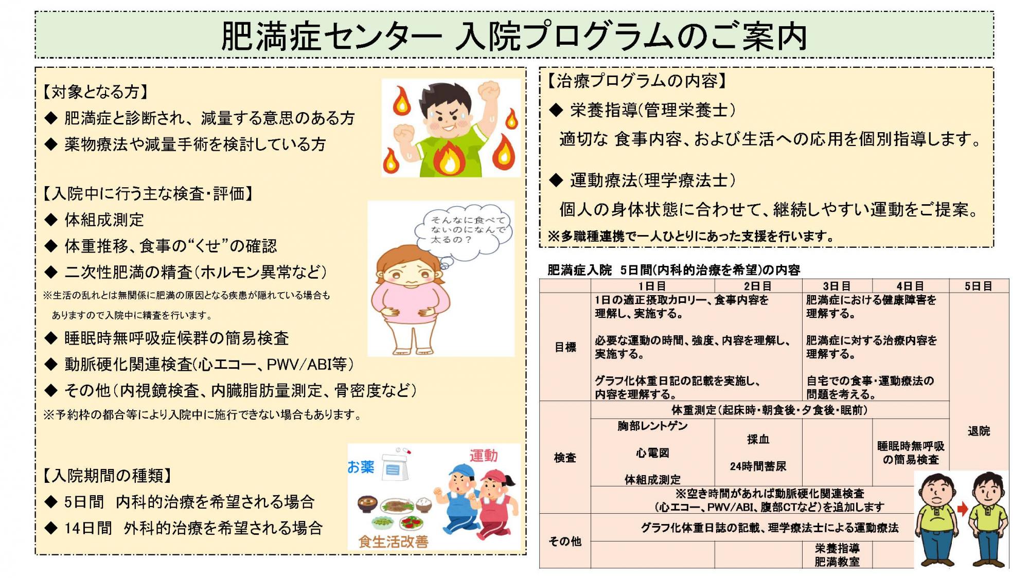 当センターでは、減量の意思のある方や薬物療法・減量手術等をご検討されている患者さんを対象に、各専門の医療スタッフが集中的治療を行う入院プログラムをご用意しております。